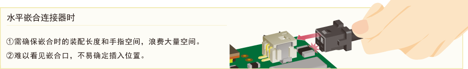 垂直嵌合不影响其他元器件,有效节省空间,提高基板设计自由度。采用从上向下的嵌合方式,易于确认嵌合口,从而更好地确定插